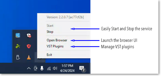 Once installed, the DreamEncoder will provide you with an icon directly on the operating system tray. Simply right click and you will have shortcut access to the service controls along with launching the browser and managing VST plug-ins.