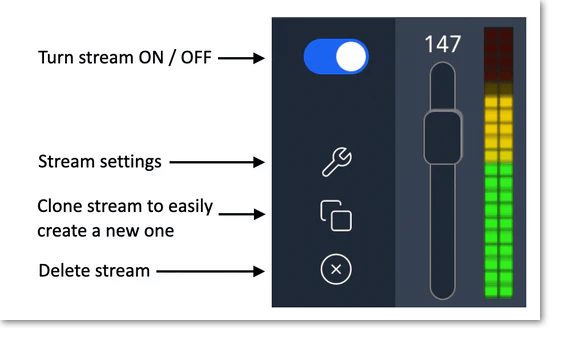 The real-time input slider will affect all streams using the same input. In other words, if you move the slider up and down, all other sliders using the same input will also move together at the same time.